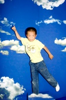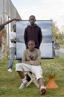 Deux décors sont en place.Des nuages avec un trampoline et un cube pour que les enfants puissent sauter dans le ciel. Une parcelle extraite du jardin en friche pour qu’ils puissent s’y rouler.