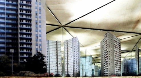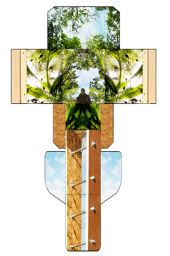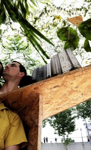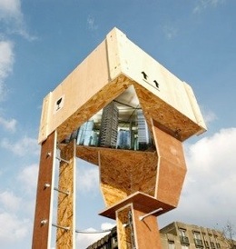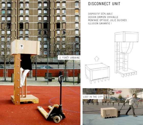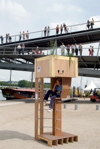 Conçue comme une cabane en kit, DU est un refuge minimum permettant seulement à la tête (et donc l'imagination) d'une seule personne d’échapper à la réalité environnante.
