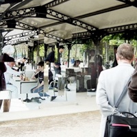 Mais une fois passée la première lecture, nous décelons le trompe l’oeil et ces détails : on devine le chassis sur lequel est imprimé l’allée verdoyante, on aperçoit les différents cadres superposés pour ne former qu’une seule image de joueurs d’échecs dans un parc parisien…